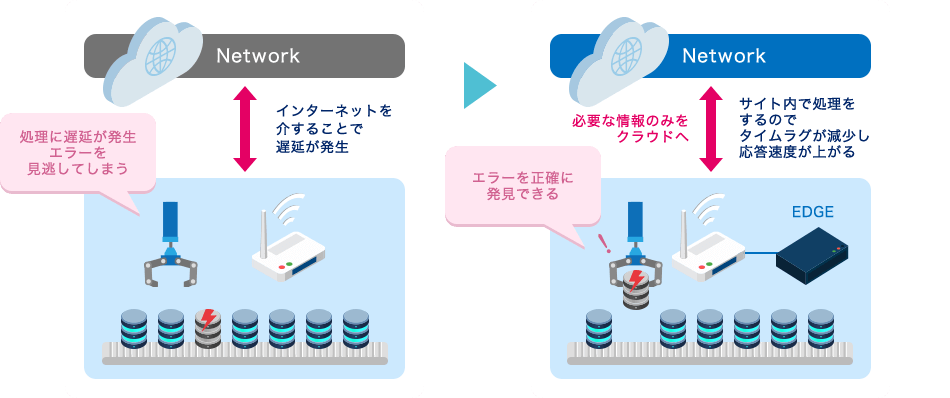 現場で起きるDXに不可欠なエッジコンピューティング。即時性が求められる現場では、データをインターネットを介してクラウドで処理することで起きる遅延は許されません。そこで、お客様サイト内にエッジコンピュータを設置して処理することで、応答速度を劇的に改善することが可能です。さらに、サイト内のエッジコンピュータで処理後、必要なデータだけをクラウドへあげることで、セキュリティ面も改善され、大量のIoTデバイスからのアクセスであってもトラフィック量を軽減できます。また、ワイヤレスで遠隔操作を行うような場面では、可搬性や耐衝撃性を兼ねそろえた設備が求められるので、特徴にあった環境構築が重要です。